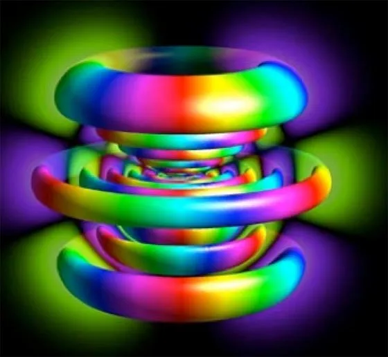 Bild 9: Die Wellenfunktion eines Elektrons in einem Wasserstoffatom. Messen würde man es mit höchster Wahrscheinlichkeit in einem der farbigen Tori. Das Proton sitzt im Zentrum der Grafik