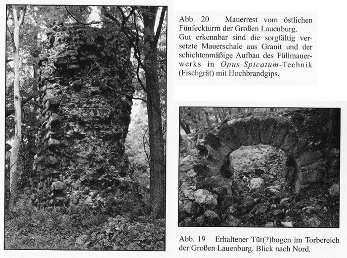 Ob bei dieser Eroberung nur die „Kleine Lauenburg" betroffen war, bleibt zunächst offen. Das archäologische Fundmaterial dieser Zeit streut jedenfalls über das gesamte Burgplateau. Die Burg scheint danach nicht mehr dauerhaft bewohnt worden zu sein. Das Mauerwerk der Lauenburg besteht durchgehend aus grobkörnigem Ramberg-Granit in sauberem Verband mit Lagerfugen. Als Bindemit-tel ist Hochbrandgips verwendet worden6. Die westlich befind-liche „Kleine Lauenburg" mit knapp 50 m Längsausdehnung hat einen quadratischen Turm von 10,5 m Seitenlänge, knapp 3 m starkem Mauerwerk und noch eine Höhe von ca. 17 m. Der Turm ist an seiner West- und Südwestseite im 19. Jh. mit Strebepfeilern gesichert worden. Der Turmzugang befindet sich an der Nordseite. Im Erdge-schoss sind die Reste eines Kamins und einer Scharte zu sehen. Die Ringmauer ist weit-gehend abgängig und nur noch in Resten erkennbar. Die Große Lauenburg mit etwa 120 m Längsausdeh-nung ist über einen 7 m tiefen Halsgraben, eine Zwinger-anlage und ein mehrphasiges Kammertor erschlossen. Die beiden fünfeckigen Türme von 10 x 12 m (Abb. 15) weisen mit ihren Spitzen auf die Angriffsseite, der westliche steht hinter einer stumpfwinkligen Schildmauer. Unmittelbar an das Tor südlich anlehnend befinden sich die Reste der Burgkapelle als Saalbau mit gestelzter Apsis.