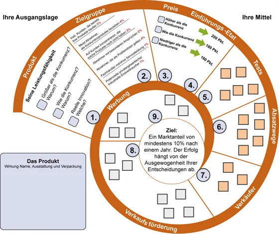 Bestimmen Sie, an wen Sie das Produkt verkaufen: Ihre Zielgruppe. Achtung! Jedem Kundenkreis entspricht ein bestimmter Marktanteil. Sie können in Anlehnung an Ihre praktische Vorgehensweise breit streuen oder in die Tiefe gehen, nur verlangt diese Übung eine Festsetzung auf 10% (siehe zentrales Feld) und keine Überschreitung.