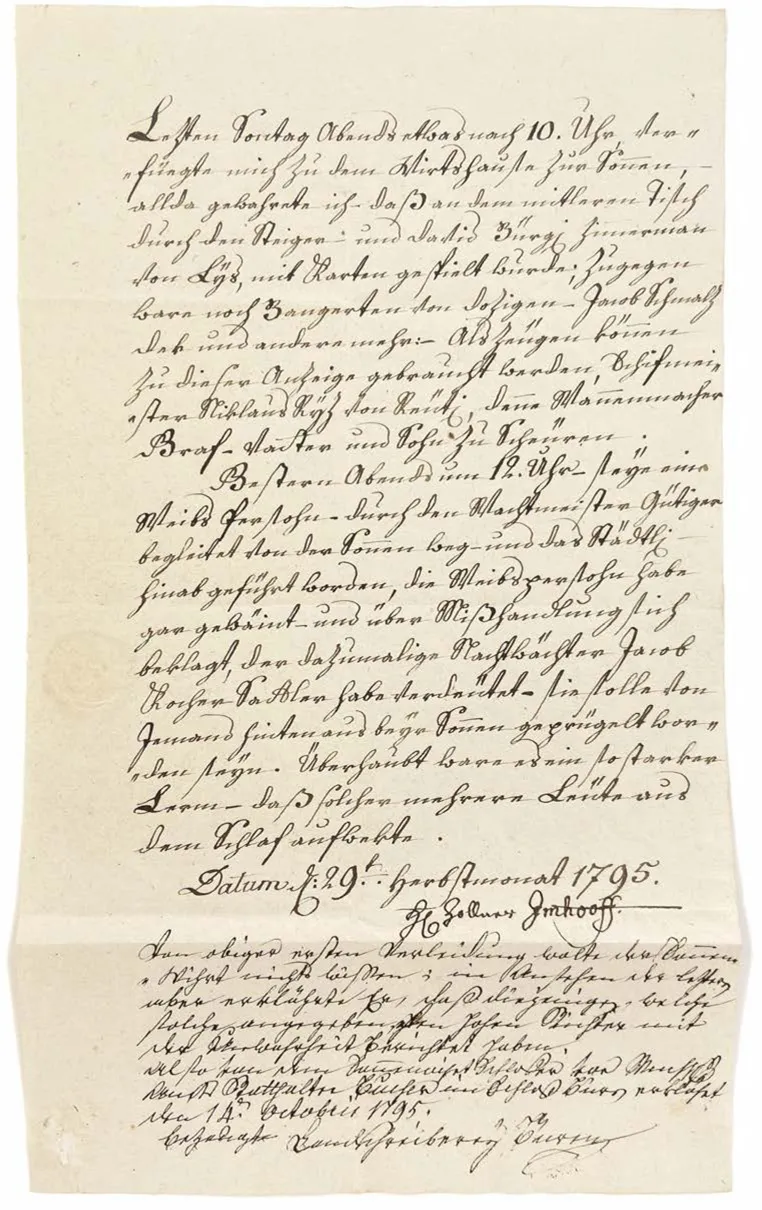 Mit erheblicher Gewissheit darf indes angenommen werden, dass der Sonnenwirt bezüglich der hier vorliegenden beiden Anzeigen im Herbstmonat 1795 nicht die volle Wahrheit zu Protokoll gab. Das vom Zöllner Imhooff in der Wirtsstube beobachtete – an den Sonn- und Feiertagen verbotene – Kartenspiel leugnete er rundweg ab; und d...