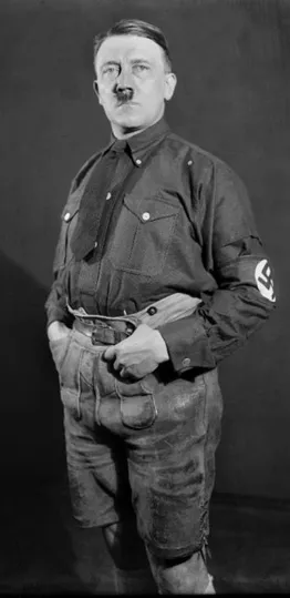Abbildung 2: Adolf Hitler um 1928 in Lederhose. Den Vertrieb dieser Aufnahme untersagte er später. US-National Archives (NARA), 111-222, public domain.