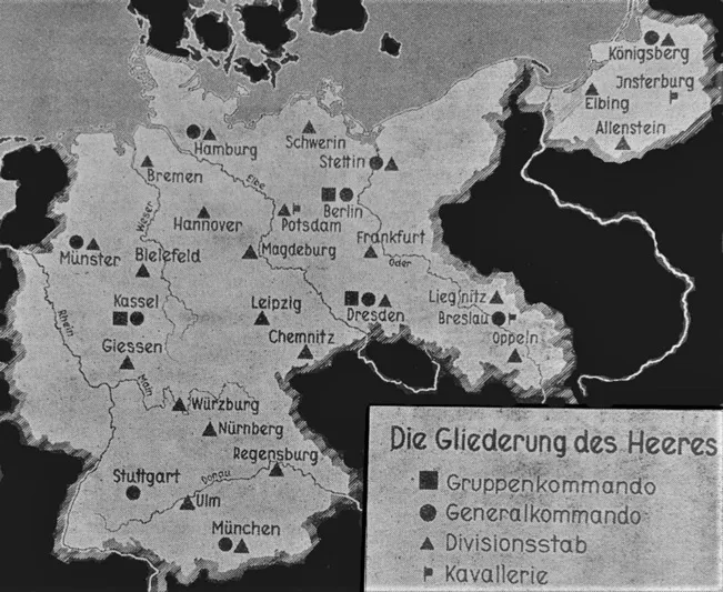 Abbildung 3: Die Heeresgliederung im Jahr 1935. Der Divisionsstab der „Gebirgler“ befand sich zu dieser Zeit noch in München, beim Generalkommando. In dieser ersten Ausbaustufe waren 24 neue Divisionen vorgesehen, zwölf weitere in der nächsten Ausbaustufe bis 1939. Foto: Eigene Bearbeitung aus Abdruck im Weilheimer Tagblatt vom 2. Nov. 1935, public domain.