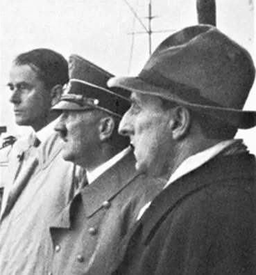 Abbildung 5: Adolf Hitler zwischen zwei "Lieblingsarchitekten". Links, ohne Hut, Albert Speer, rechts, mit Hut, Roderich Fick. Ausschnitt aus Foto: Institut für Kunstgeschichte, Universität Wien, CC-SA-BY 3.0