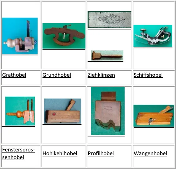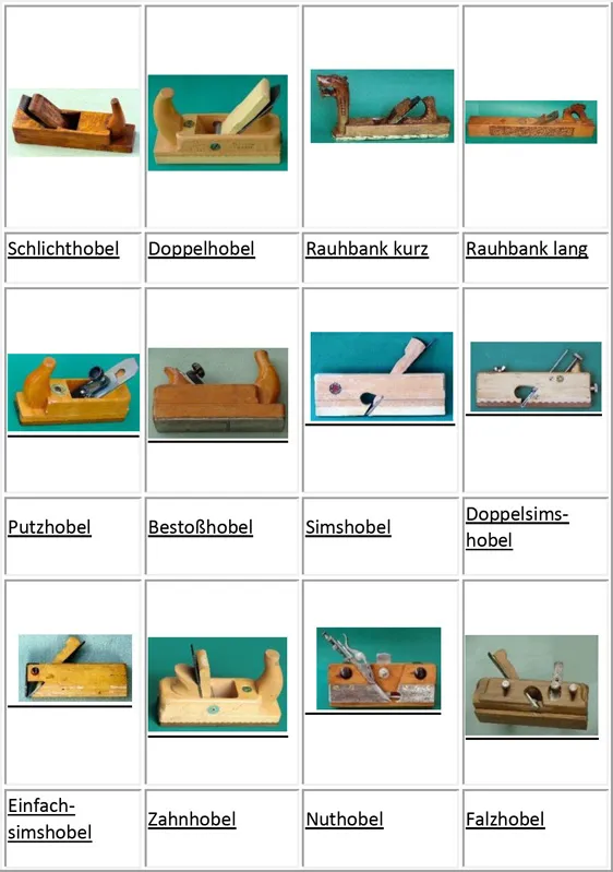 Hobel sind die am meisten verwendete Handwerkzeuge. Hier aufgeführt sind deshalb keine Elektromaschinen, Hilfswerkzeuge wie Hobelbänke, Schraubzwingen, Schraubendreher Zangen usw. Viele der hier aufgeführten Werkzeuge werden auch in anderen Berufen benutzt. Das sind z. B. Küfer, Korbmacher, Stellmacher, Zimmermänner und, und.