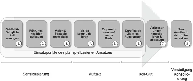 Abb. 1: Zuordnung der Einsatzpunkte des planspielbasierten Ansatzes in Phasen des Change-Managements nach Kotter (2011)