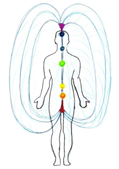 Es gibt 8 Hauptenergiezentren - 8 Hauptchakren, die entlang einer vertikalen Achse an der Körpermitte liegen. Davon befinden sich sieben Chakren im Körper und das achte Chakra ca. 10 cm über dem Kopf. Die Chakren sind trichterförmig, wobei der untere, dünne Teil des Trichters direkt mit der Wirbelsäule (Zentralnervensystem) verbunden ist, und der Trichter sich vom Körper weg hin öffnet (siehe Abb. 2).