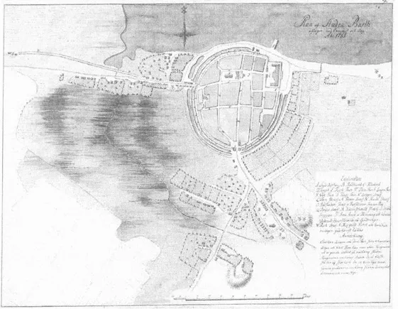 3 Die Abbildung auf der nächsten Seite zeigt die Stadt Barth Mitte des 18. Jahrhunderts. Die Beschriftung der Karte – hier in schwarz-weiß und nicht koloriert –, der Titel sowie die Erläuterungen und Anmerkungen sind in schwedischer Sprache. Die Karte ist möglicherweise im Zusammenhang mit der Schwedischen Landesaufnahme von Vorpommern 1692 – 1706 entstanden. Der Maßstab am unteren Kartenrand ist nicht zu entziffern.