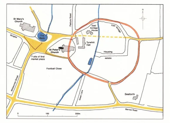 Barton-upon-Humber. Etwa kreisförmige Grabenanlage (orange) um Tyrwhitt Hall mit Eintragung der Kirchen St. Peter und St. Mary und frühe Straßen und der mögliche erste Marktplatz (gelb). Nach RODWELL. Entnommen aus [RODWELL/ATKINS, 160]