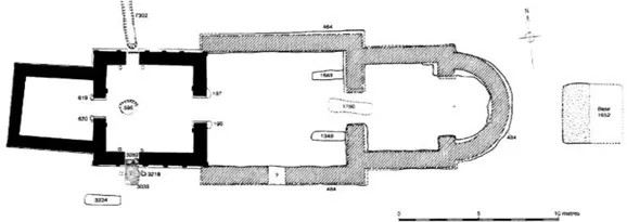 Der Turm hatte zwei Annexbauten, einen im Westen, als Baptisterium gedeutet, und einen im Osten, angeblich ursprünglich ein Altarraum.