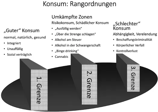 Wenden wir uns nun etwas genauer dem Feld zu, auf welchem bestimmt wird, was normal ist und was nicht. Die Identifizierung und Markierung von Menschen als »nicht-normal« aufgrund gesellschaftlich produzierter Vorstellungen verläuft auf verschiedenen Ebenen und mithilfe einer durch die Gesellschaft gezogenen Trennlinie, nämlich jene der Pathologisierung. Sie scheidet zwischen jenen Personen, die als »suchtkrank« diagnostiziert und einer Behandlung zugeführt werden sollen, und jenen, die (noch) nicht so klassifiziert werden (können) und bei welchen präventiv eingewirkt werden soll, um eine unerwünschte Entwicklung zu verhindern. Gayle Rubin (2003) hat in ihrem Versuch, eine radikale Theorie der Sexualität zu entwickeln, zwei Modelle vorgestellt, die sich wunderbar auf unseren Bereich übertragen lassen. Das erste ist jenes der Zonen des Akzeptierten (siehe Abbildung 1). Hier unterscheiden wir zwischen dem normalen und akzeptierten Konsum (z. B. moderat, legal, innerhalb etablierter sozialer Rituale und Konventionen) und dem gesellschaftlich nicht akzeptierten Konsum (z. B. illegal, intravenös, unhygienisch). Dazwischen gibt es noch eine umkämpfte Zone, in welcher Themen jeweils kontrovers diskutiert werden. Aktuell sind das Themen wie »Komasaufen«, Cannabis, aber auch Glücksspiel.