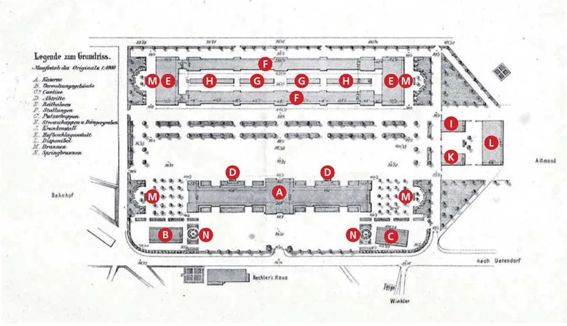 Zuerst musste der Situationsplan eingereicht werden. Dieser wurde am 12. Oktober 1863 durch den Bundesrat genehmigt. Die später umgesetzte Anlagedisposition mit Kaserne, Stall- und Reithallentrakt, mit den geforderten Höfen und den beiden Nebenbauten an der Allmendstrasse war im Plan bereits enthalten. Hingegen taucht der vorgeschlagene symmetrische, dreiecksförmige Westabschluss mit einem dreiteiligen Bautenkomplex mit Krankenstall, Hufbeschlagsanstalt und einem weiteren Gebäude, flankiert süd- und nordseitig von Rasenparterres, später nicht mehr auf. Bezüglich der Ein- und Durchgangsachse symmetrisch gesetzt, flankieren zwei Nebenbauten an der Allmendstrasse die Kaserne: das westliche mit vorgesehener Kantine an Stelle des bestehenden Bauernhauses, des Hürnerhauses, das östliche war als Verwaltungsgebäude vorgesehen. Die im Raumprogramm besonders betonte Aussenraumgestaltung nimmt im Plan einen wichtigen Stellenwert ein. Eine Allee kreuzt die gesamte Anlage in Ost-West-Richtung, Rasenparterres flankieren Kaserne, Stall- und Reithallentrakt mit halbkreisförmigen Ausschnitten, und über 200 Bäume zieren die Gesamtanlage.