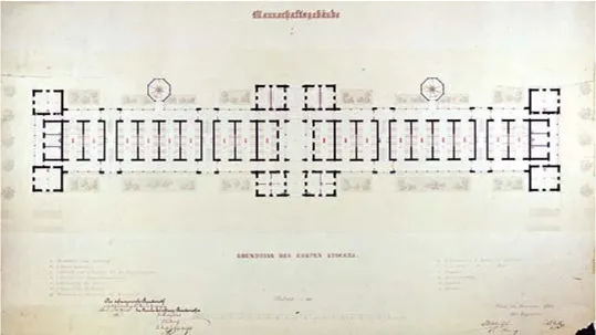 Reithallen-Stalltrakt (heute Mannschaftskaserne 2). Der Mittelbau von Norden und Blick in den Hof Richtung Osten.