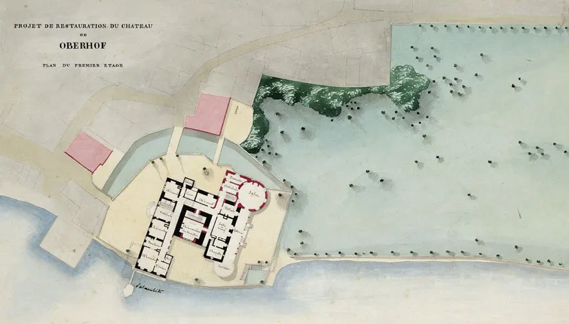 Um 1846/48 präsentierte James Colin anhand eines Feder/ Aquarell-Planes ein Projekt für den Schlossumbau. Dabei hielt er auch den Obstgarten fest. Nordöstlich begrenzt ein Wassergraben den Schlossbereich, südöstlich eine Mauer. Ein direkter Zugang zum Obstgarten ist noch nicht erkennbar.