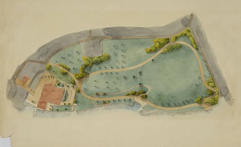 1850 fasste man das Gartenprojekt ins Auge. Colins Plan sieht noch keine Broderien auf zwei Ebenen im schlossnahen Bereich vor, doch folgt die Parkdisposition mit ihren Serpentinenwegen ganz den Prinzipien eines Landschaftsparks.