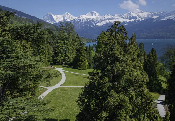 Das Schloss und der Park von Oberhofen liegen direkt am Ufer des Thunersees und bieten einen atemberaubenden Blick auf See und Alpen. Der Park, wie er sich heute zeigt, entstand in seinen Grundzügen, nachdem das Schloss 1844 in den Besitz der gräflichen Familie de Pourtalès übergegangen ist. Der Obstgarten wurde in einen Park im Stil der englischen Landschaftsgärten umgewandelt und seither schmücken farbenprächtige Rabatten die hausnahen Gärten. Die eindrucksvolle Verschmelzung von Park und umliegender Landschaft macht die Faszination dieser Anlage aus. Bis heute hat die Attraktivität dieser Gartenoase an nichts eingebüsst. Sie ist ein einzigartiges Beispiel einer historistischen Gartengestaltung des 19. Jahrhunderts im Alpenraum.