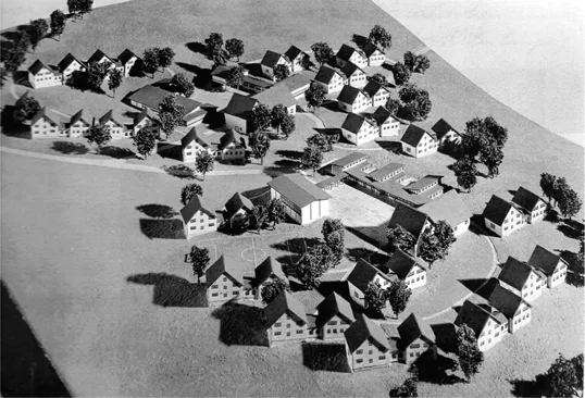Modell für das Kinderdorf Pestalozzi in Trogen (1947): ein in sich abgeschlossener Weiler aus standardisierten Kinderhäusern und einem Zentrum mit Gemeinschaftseinrichtungen.