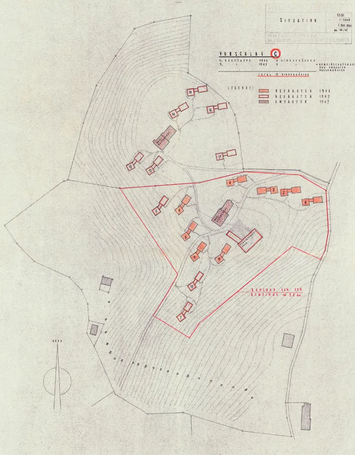 Hans Fischli entwarf das Kinderdorf Pestalozzi mit den Bauernhäusern Büel (oben) und Grund (unten). Die Stiftung konnte später auch die Parzelle mit dem Nagelhaus im Nordosten erwerben.