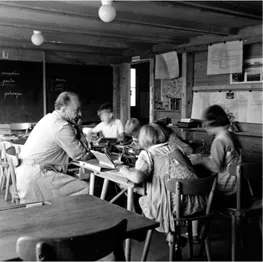 Einfach, zweckmässig, sicher und aus einheimischem Holz: schlichte Geländer und Raumteiler im Treppenhaus des Kinderhauses (links), Mobiliar und Schulzimmer-Ausstattung – alles Entwürfe von Hans Fischli (rechts).