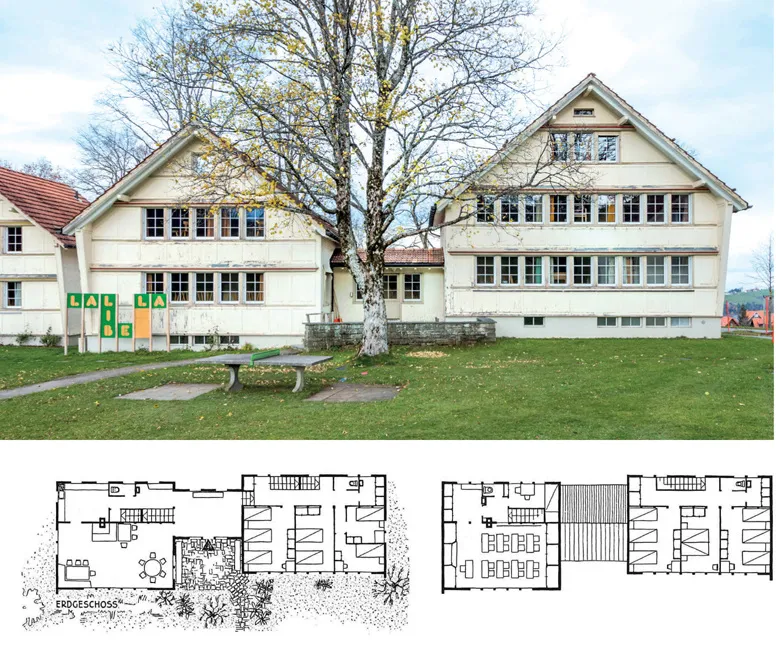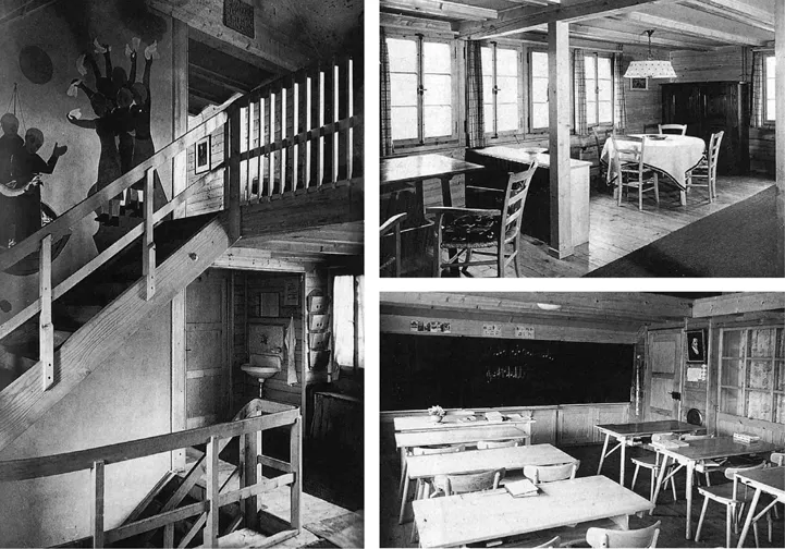 Schulzimmer, Esssaal und Küche sowie auch die Wohnräume der Erwachsenen (Hauseltern und Lehrer) gehörten zum Raumprogramm des Wohntrakts. In dessen Untergeschoss befanden sich die Werkstätten (für Werken und Handarbeit). Das Untergeschoss des Schlaftrakts nahm die WC, Bäder und Duschen für die Kinder auf. Die Schlafräume waren im Erd-, Ober- und Dachgeschoss. Alle Räume und auch das Mobiliar gründeten auf einem kindergerechten modularen Grundraster von 90 x 90 cm, nach welchem Hans Fischli das Standardhaus entwarf.