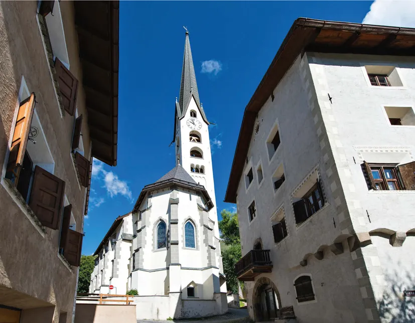 Die Kirche San Luzi ist schwer zu übersehen. Mit seinen 67 Metern überragt ihr spitzer Turm die übrigen Gebäude des Dorfes. Das ursprünglich im romanischen Stil erbaute Wahrzeichen von Zuoz wurde kurz nach 1200 errichtet. Der spätgotische Chor ist 1507 neu erstellt worden. Seine vom Kirchenschiff leicht abgewinkelte Ausrichtung erweckt den Eindruck, als ob er nach dem Licht des Südens haschen wolle.