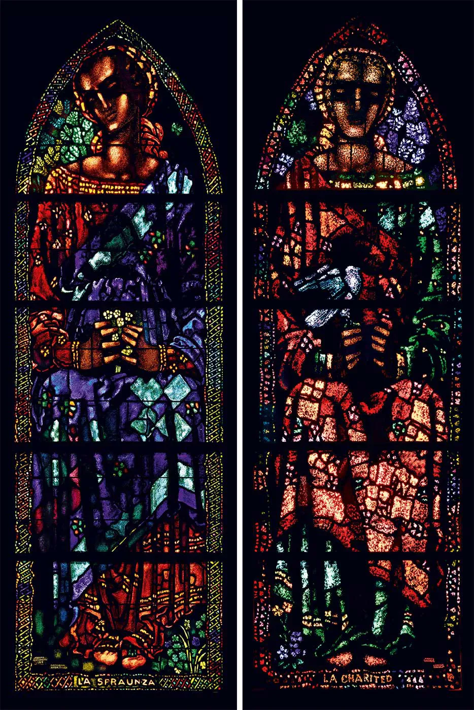 Giacometti hat die drei Tugenden schliesslich aber doch noch vollständig realisiert. Zwar nicht in Zuoz, sondern für die Pauluskirche in Zürich-Unterstrass. Praktisch gleichzeitig mit dem zweiten Zuozer Fenster rezykliert er Anfang 1933 die Grundidee in einem einbahnigen Fenster für die wuchtige Stadtzürcher Kirche. Hier sind die ebenfalls sitzenden Figuren aus Platzgründen jedoch übereinander angeordnet. Ob Giacometti schon eine erste Skizze für das dritte Zuozer Fenster angefertigt hatte, ist nicht belegt – ein entsprechender Hinweis ist im handschriftlichen Werkverzeichnis des Künstlers nicht zu finden.