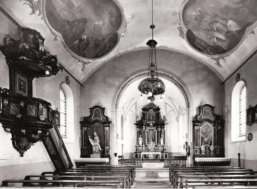 Das Innere der Pfarrkirche nach Osten vor der Restaurierung von 1982-83. Fotografie aus der Zwischenkriegszeit.
