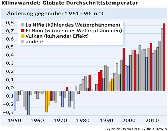 Nach Angaben der Weltmeteorologie-Organisation (WMO) ist der Erwärmungstrend nach wie vor ungebrochen. 2016 war das wärmste Jahr seit Beginn der Aufzeichnungen. Die globale Durchschnittstemperatur lag 1,1 °C über dem vorindustriellen Mittelwert und 0,06 °C über der des vormaligen Rekordjahres 2015. Außerdem wurde 2016 der Temperaturanstieg in den ersten Monaten noch durch den starken El Niño 2015/16 verstärkt. Dies führte auch in den Ozeanen zu den höchsten je gemessenen Temperaturen an der Meeresoberfläche. In den hohen Breiten stieg die Temperatur stärker als im globalen Durchschnitt; so lag die Jahresdurchschnittstemperatur auf Svalbard (Norwegen) mit –0,1 °C um 6,5 °C über dem Mittelwert von 1961–90.“5