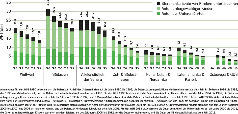 1. Unterernährung: Für die Berechnung der Werte des WHI 1990, 1995, 2000, 2005 und des WHI 2013 wurden aktualisierte Daten der Ernährungs- und Landwirtschaftsorganisation der Vereinten Nationen (FAO) verwendet. Die Daten zur Unterernährung, die für den WHI 2013 verwendet wurden, beziehen sich auf die Jahre 2010 bis 2012 (FAO 2013a; Schätzungen der Autoren). Um aktuellere Daten zur Verfügung zu stellen, die alle relevanten Informationen beinhalten, hat die FAO ihre Methodik zur Schätzung von Unterernährung überarbeitet. Die Angaben berücksichtigen nun Erkenntnisse einer weitaus größeren Zahl von Haushaltsbefragungen, die in den letzten Jahren verfügbar wurden, und erstmalig auch Schätzungen von Nahrungsmittelverlusten auf der Ebene des Einzelhandels (FAO 2012).