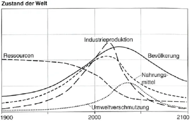 Die Grafik veranschaulicht das Standardszenario. Sie zeigt, wie sich die Menschheit entwickeln würde, wenn Bevölkerungswachstum, Nahrungsmittelproduktion, Industrieproduktion, Verschmutzung und Nutzung nicht erneuerbarer Ressourcen ihren jeweiligen Kurs unverändert beibehalten.