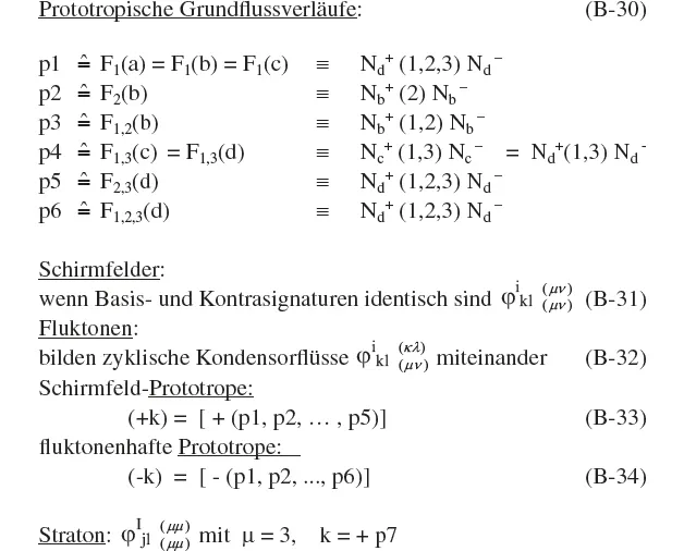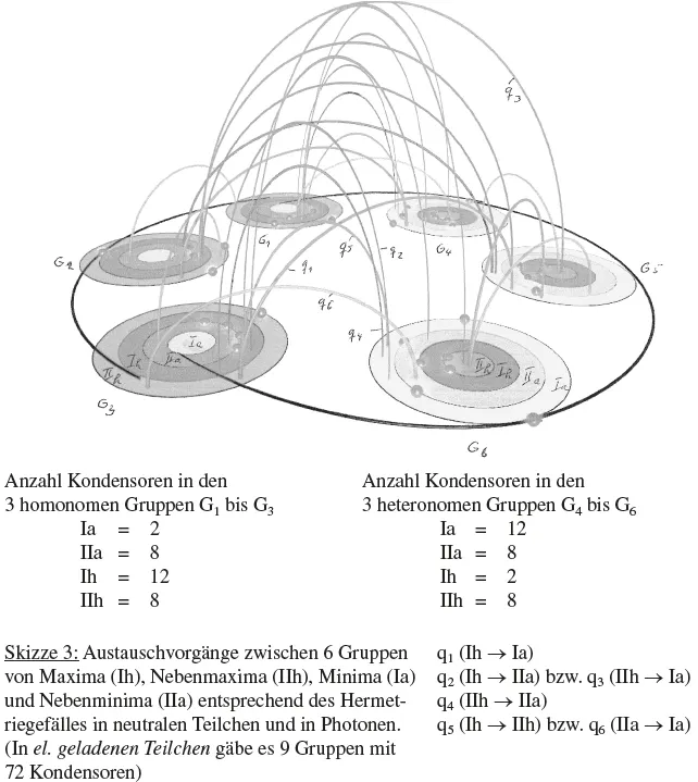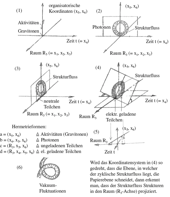 Skizze 2: Physikalisch mögliche Strukturen als metrische Deformationen des Raumgitters bzw. von Metronen-Kondensationen in den Unterräumen des R6-zyklische Strukturflüsse besitzen Trägheit. Die Vakuum-Schwankungen sind ebenfalls Metronenverdichtungen in Unterrämen, die jedoch aperiodisch erfolgen.