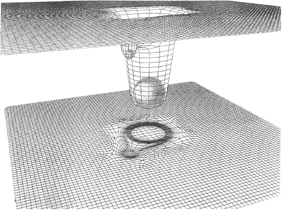 Skizze 1: Dreidimensionale Raumkrümmung durch die Gravitationsfelder von Erde und Mond in einer 2-dimensionalen Darstellung (nach Einstein) und die Projektion des deformierten Raumgitters auf die Ebene (nach Heim). Die Krümmung entspricht einer Kompression oder Kondensation der Metronen (angenäherte Darstellung).