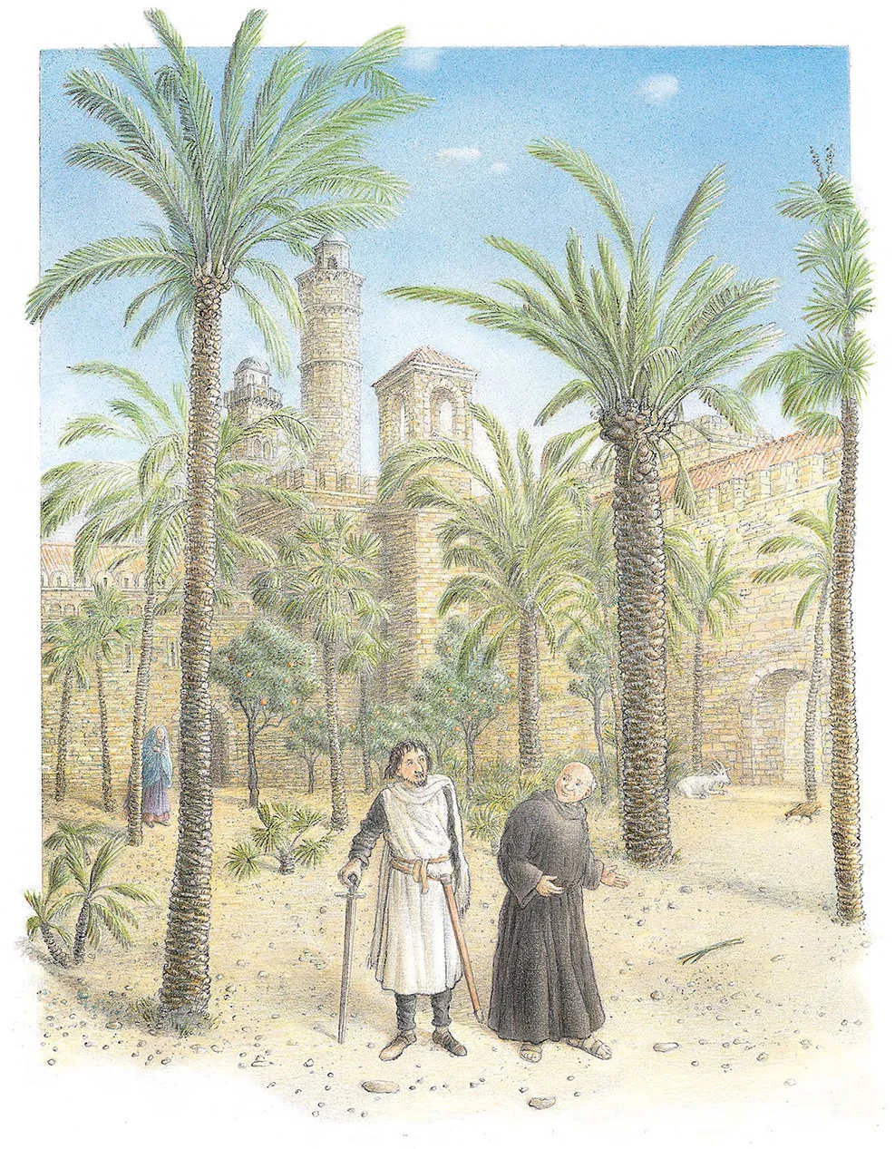 Eilig begab sich Daja wieder zu den Palmen, doch der Tempelherr war nicht mehr allein: Ein Klosterbruder folgte ihm in kurzem Abstand. Der Tempelherr bemerkte dies wohl, drehte sich endlich um und sagte: »Guter Bruder, falls Ihr eine Spende wollt, ich habe nichts zu geben.«