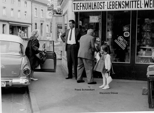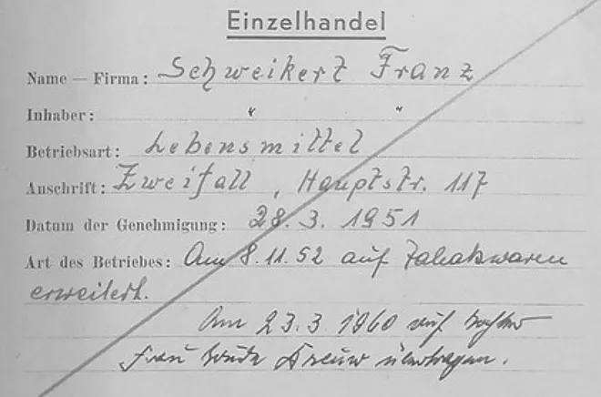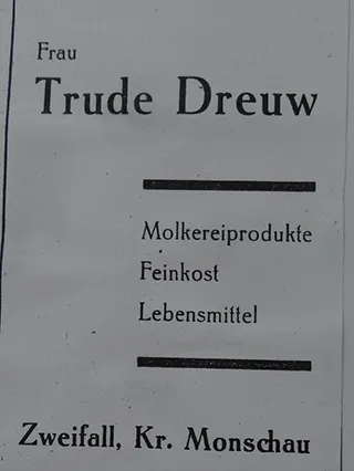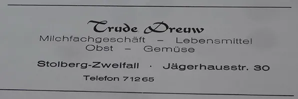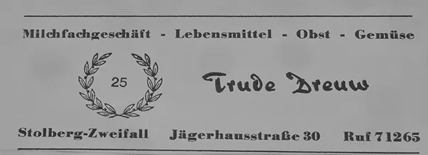 Aus der Chronik von Eleonore Radermacher geb. Dreuw ergibt sich folgendes: Im Jahre 1950 hat Gertrud Schweikert das Gewerbe für eine Michverteilungsstelle angemeldet. Im März 1951 hat ihr Vater die Genehmigung zur Eröffnung eines Lebensmittelgeschäfts erhalten. 1955 heiratete Gertrud Schweikert Josef Dreuw. Beide erweiterten 1958 die Verkaufsräume durch einen Anbau in Richtung Jägerhausstr. Josef Dreuw fuhr mit einem Verkaufswagen (Milch-Sahne-Käse) durch den Ort und bot seine Waren an. Derzeit kann nicht ermittelt werden in welchen Jahren das der Fall war.