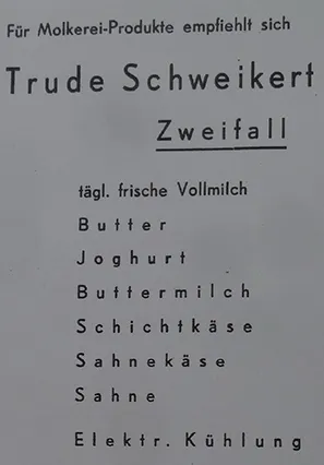 Die Zweifaller Geschäftswelt im zwanzigsten Jahrhundert.Mit der zweiten Ausgabe über die Zweifaller Geschichte im letzten Jahrhundert befasst sich die Abteilung Geschichte der IG Unser Dorf Zweifall mit der Chronik der Geschäfte. In diesem ersten Teil geht es um die Grundversorgung, sprich Lebensmittel, Fleisch und Backwaren.Wir haben lange recherchiert und mehrere ältere Zweifaller befragt um zu diesem Ergebnis zu gelangen. Es erhebt keinen Anspruch auf Vollständigkeit.
