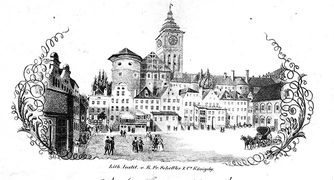 Abbildung 5: Der Altstädtische Kirchplatz mit Blick zum Schloss in Königsberg. Lithographie von Anfang des 19ten Jahrhunderts als Briefkopf von K. H. Bartisius überliefert.