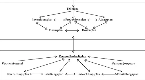 Folgende Übersicht zeigt die Interdependenz (wechselseitige Abhängigkeit) zwischen der Unternehmensplanung im Gesamten und dem Bereich Personalwirtschaft anhand der Personalbedarfsplanung.