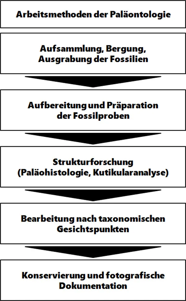 Die Paläontologie verfügt aufgrund ihrer zahlreichen Teildisziplinen über ein breites Spektrum an Arbeitsmethoden, wobei technische und wissenschaftliche Methoden in enger Assoziation zueinander stehen (_ Abb. 2). Am Beginn der paläontologischen Forschung steht die Aufsammlung, Bergung oder Ausgrabung der im Zentrum des wissenschaftlichen Handelns stehenden Fossilien. Die Aufsammlung — etwa auf Feldern oder in Gärten — stellt dabei sicherlich die einfachste Form des Zugangs zu den versteinerten Lebewesen dar. Die Bergung von Fossilien findet zumeist in Sand- und Ziegelgruben oder in Steinbrüchen statt und erfordert bereits einen wesentlich höheren technischen Aufwand. Die Ausgrabung schließlich repräsentiert eine nach genauer vorheriger Planung ablaufende Freilegung der Versteinerung, wie sie beispielsweise in Höhlen oder Spaltenfüllungen stattzufinden hat. Dabei können mitunter auch schwere Maschinen zum Einsatz gelangen, welche eine Abtragung mächtigerer Deckschichten herbeiführen. Hierbei ist immer darauf zu achten, dass die ursprüngliche Lage der Fossilien erhalten bleibt, damit eine möglichst exakte Dokumentation der Fossilisation sowie eine entsprechende stratigrafische Zuordnung durchgeführt werden kann.