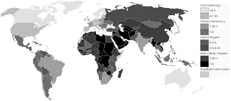 Demokratie wird durch Operationalisierung ihrer Merkmale, also Beobachtung von Indikatoren, messbar gemacht (Müller & Pickel 2007). Der Demokratieindex der Zeitschrift ‚The Economist‘ (2020) basiert auf 60 Fragen, anhand derer der Grad der Demokratie in 167 Ländern jährlich gemessen wird. Im Ergebnis stehen voll- und unvollständige Demokratien (das heißt die Behauptung oder Annahme, es herrsche Demokratie, ist zu einem bestimmten Grad eine Täuschung), ‚Hybridregime‘ beziehungsweise am anderen Ende der Skala mehr oder weniger autoritäre Staaten (Abbildung 3).