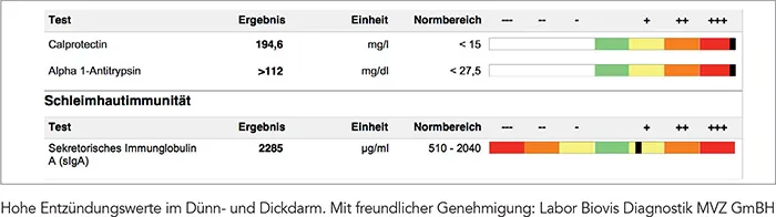 Wenn Mastzellen einmal gereizt sind – von E-Stoffen, von Fast Food mit Transfetten, durch einen Candida-Befall oder SIBO (Small Intestinal Bacterial Overgrowth/Dünndarmfehlbesiedlung) – reagieren sie auch mehr als deutlich: Sie schütten Histamin und andere Mediatoren aus, und ihr Besitzer bekommt entsprechend Krämpfe, Durchfälle, Blähungen. Im Grunde genommen wird bei jeder Entzündung, jeder Infektion im Darm und jeder Nahrungsmittelallergie, egal ob Sofort-Allergie (IgE) oder Spät-Allergie (IgG4/IgG), Histamin ausgeschüttet. Wenn wir nun bereits einen hohen Histaminspiegel im Darm festgestellt haben und wir Beschwerden haben, muss durch eine Stuhluntersuchung zunächst das Ausmaß der Entzündung begutachtet werden. Dafür benötigen wir folgende Werte: