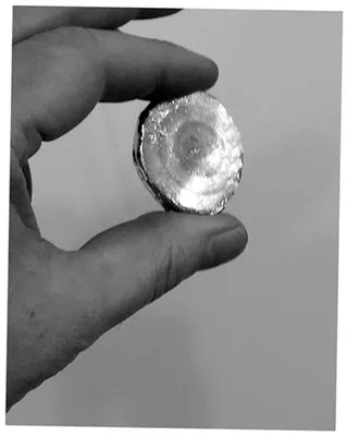 Für diese einfache Münzform benötigt man lediglich ein Teelicht, mit dessen Hilfe zwei dünne runde Bleche erstellt werden. Die kerze wird aus der Halterung genommen und ein wenig flüssiges Gallium hineingegossen. Die optimale Menge muss man experimentell herausfinden. Zu wenig Gallium sorgt dafür, dass die Form nicht komplett rund wird.
