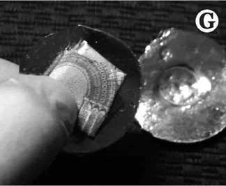 Der Schein ist komplett in den beiden Blechen eingschlossen, jetzt werden die beiden Hälften miteinander verlötet, um eine geschlossene Münze zu erhalten. Dazu wird eine Messerspitze über einer Kerze kurz erhitzt. Anschließend wird mit schneller Bewegung quer über beide Münzhälften gewischt. Die Wärme lässt die oberste Schicht flüssig werden und verlötet beide Hälften. Zwischenzeitig muss man das Metall erkalten lassen. Dann fährt man mit dem Vorgang fort. Am Ende hat man eine komplett verschlossene Münze, die bedenkenlos dem Publikum überreicht werden kann. WICHTIG: Je dünner das Blech, desto schneller löst es sich im heißen Wasser auf. Ein „Silberflutschi" dieser Art verwandelt sich meißt so schnell, dass das Gefäß gar nicht kurz bedeckt werden muss.