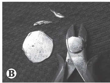 Nun werden bei beiden Blechen rundherum ein paar Millimeter des Materials abgeknipst, um so den Durchmesser zu verkleinern.