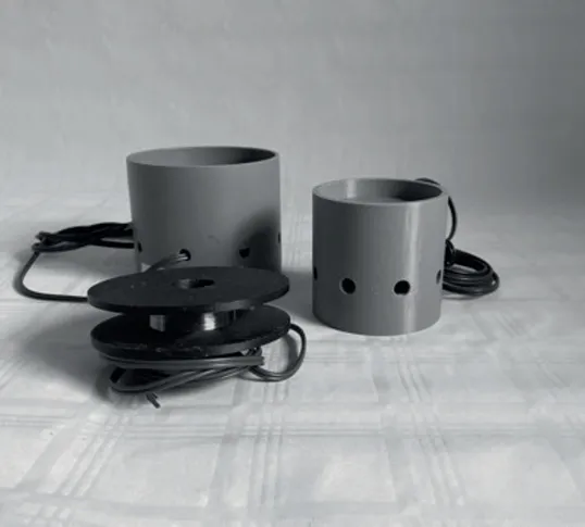 Induktionsspulen zur Stromerzeugung haben den Vorteil, dass sie keinen Eisenkern brauchen. Sie können bei kleinen Leistungen gut eingesetzt werden. Der bauliche Aufwand ist gering. Benötigt wird ein Spulenkörper auf dem ein dünner Kupferdraht aufgewickelt wird. Je höher die Windungszahl ist, um so höher ist die Ausgangsspannung. Eine Induktion funktioniert nur wenn ein elektrischer Leiter in einem Magnetfeld bewegt wird. Bei meinen Stirling Freikolben Motoren wird jedoch ein Dauermagnet in einer Spule bewegt. Das hat den Vorteil das die zwei Drähte die von der Spule kommen nicht bewegt werden müssen. Damit können sie einen Leiterbruch vermeiden. Sie können über ein kleines Loch die Leiter oder ein Kabel aus dem Gehäuse führen und luftdicht verkleben.