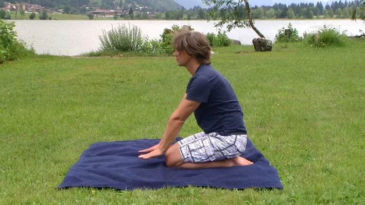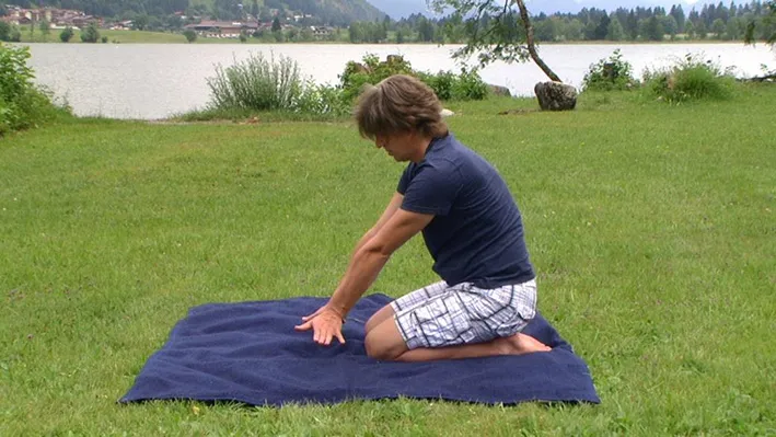 Wieder kniend: Nun drehe wieder die normal flach aufgelegte Hand nach außen, und weiter drehen bis dass die Fingerspitzen zu den Knien zeigen. Die Hände ganz flach am Boden liegend setze Dich wieder mit durchgestreckten Armen zurück auf die Fersen und verweile in der Spannung, so lange, wie es nur geht. Und wie immer nicht übertreiben! Danach die Spannung lösen und alles lockern.
