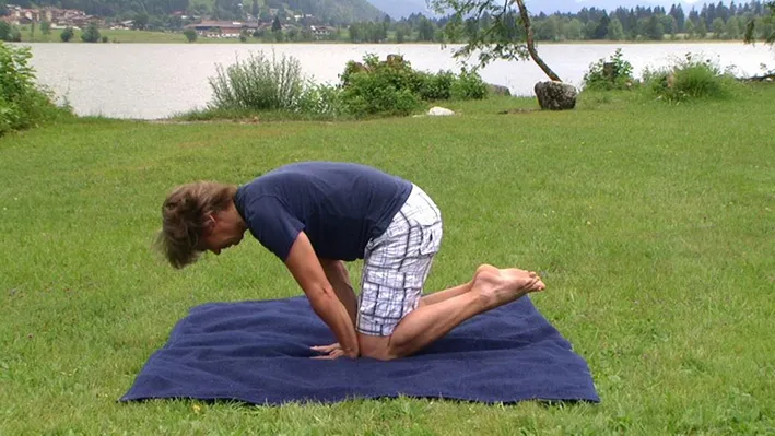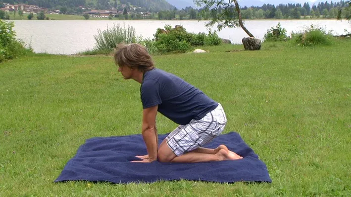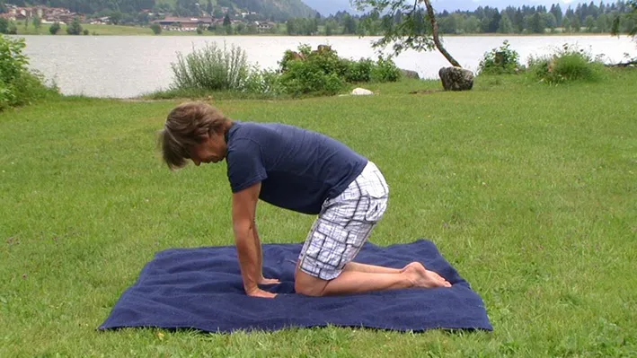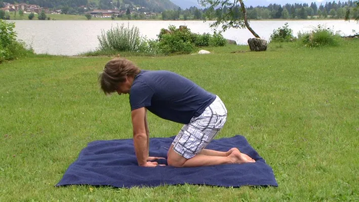 Knie Dich auf den Boden und lege die Hände flach auf den Boden direkt vor die Knie. Nun beuge Dich nach vorn – so weit es geht, jedoch ohne dass die Hände vom Boden abheben. Verweile so lange wie möglich in dieser Spannung. Gehe nur bis zu Deiner inneren Schmerzgrenze, nie überdehnen!