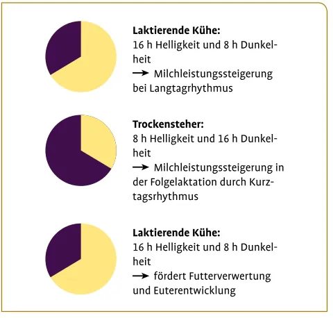 Trockensteher hingegen zeigen eine Milchleistungssteigerung in der Folgelaktation, wenn Sie einen Kurztagrhythmus mit 8 Stunden Helligkeit und 16 Stunden Dunkelheit erhalten.