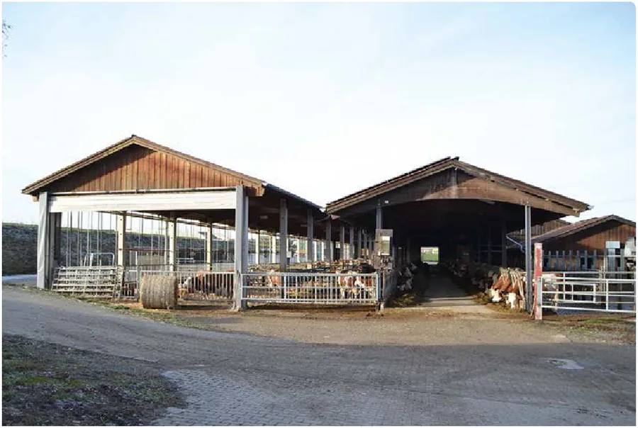 Im Gegensatz zur Weide können die Tiere einen Laufhof sogar ganzjährig nutzen. Mehrhäusig gebaute Stallungen haben neben niedrigeren Baukosten den Vorteil, dass der Laufhof integriert werden kann. Das kann dazu beitragen, zusätzliche Emissionen gering zu halten: Ein integrierter Laufhof ist geschützter und kann in der Regel mit Schieber entmistet werden. Praktisch ist außerdem, dass die zusätzliche Fläche dort angeboten wird, wo die Tiere den größten Platzbedarf haben – im Fressbereich (Abb. 2).