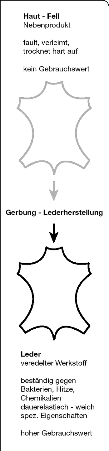 Gelingt es, die vom Tierkörper abgezogene Haut so zu verändern, dass die natürliche Zersetzung gar nicht mehr stattfindet, dann wurde ein dauerhaftes Material hergestellt, und dieses Material nennt man „Leder“.