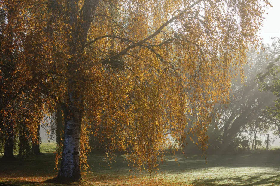 Tristes Novembergrau? Mitnichten – markante Baumsolitäre, wie diese Sand-Birke (Betula pendula) in Herbstfärbung, haben das Potenzial für stimmungsvolle Augenblicke und begeistern den Betrachter stets aufs Neue.