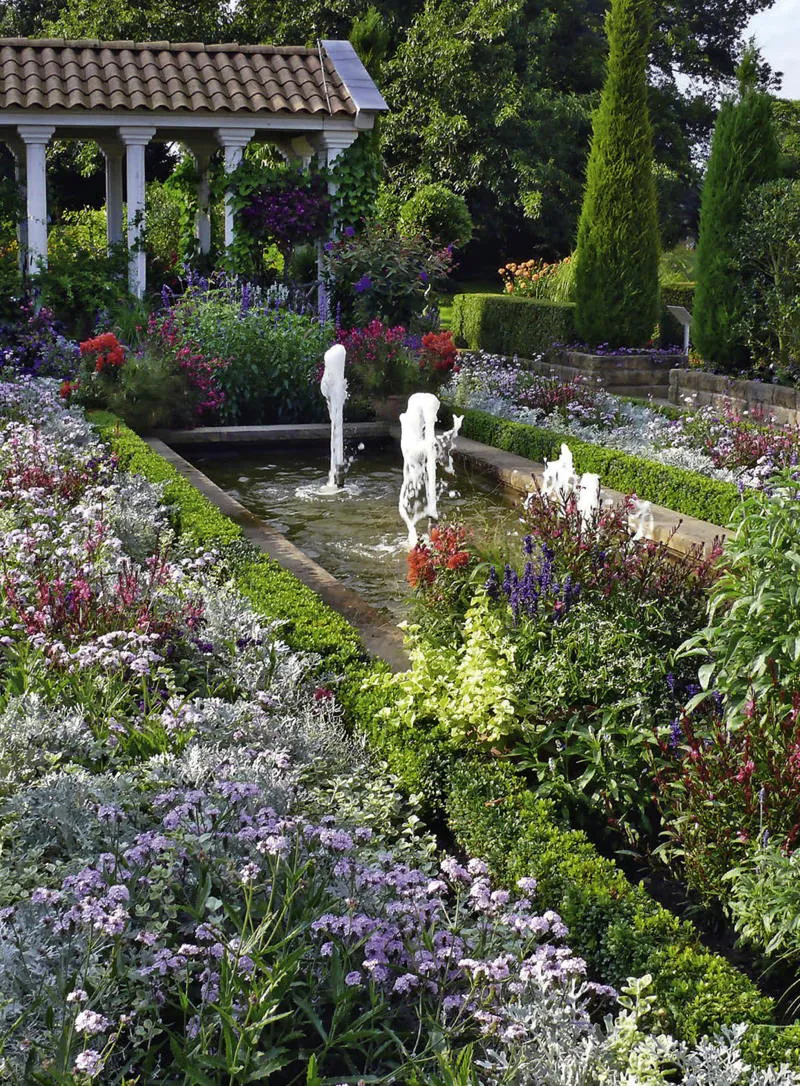 Im länglichen, geometrisch angelegten Garten des Südens sprudeln kleine Fontänen im Wasserbecken. Eine überschwängliche Bepflanzung nimmt der Gestaltung ihre Strenge. Lampenputzergras (Pennisetum setaeum), Prachtkerze (Gaura lindheimeri) und Einjährige wallen über die Beckenränder und Wegekanten.